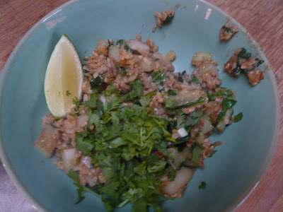 Here, a chopped up old head of bok choy comes together with some leftover Chinese take-out brown rice sauteed in scallions and garlic. Hit with some miso tamari (pantry) whipped with a few eggs and voila-there’s enough for 5 bowls of food. Scrounge a cucumber and some cilantro form the crisper, squeeze on some lime and you’re good to go. A little leftover rose saved my day and night too, I admit. And, I’m reminded that I must stock up the freezer and pantry for the next, “there’s nothing in the house”dinner.