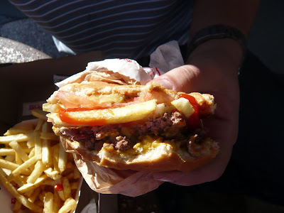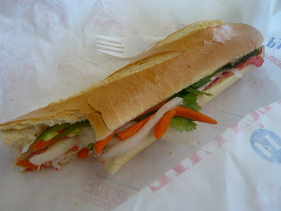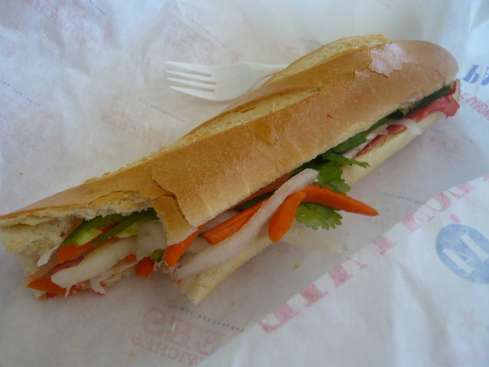 After a great morning interview at L.A.’s NPR show Good Food with Evan Kleinman (such a smart interviewer) we headed down to Irvine for another TV taping. Fortunately my straight up L.A, breakfast of a greenfood smoothie left me hankering for lunch and we had plenty of time to do so. So while D.C. is home to the second largest Vietnamese population outside of Saigon, Orange County is home to the first. Me, I wanted a classic Viet sandwich (Banh Mi) but my tour partner/son had his heart set on an Inside Out burger–something HIS friends said should be his first taste of L.A. Mine was healthy, fresh and spicy. His? well–he LOVED it. It was ordered as a double double animal-style (huh?) and I also saw him put some ketchup dipped french fries between the layers too. One of my tips of home cooking for guys is to notice what they’re eating out and try to make it better at home. I’ll file that little detail for a future experiment.