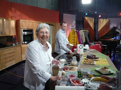 One of the zany things about visiting TV stations across the country is coming across so much local talent/news folks/producers/and various other denizens of morning television. Here in Minneapolis, our escort/food team of Isabel and Tim are so well liked and friendly that we’ve had a really fun morning. Pictured above is Lois, one of their food stylists who, at 80 years old is still doing her thing. Yesterday she was working with the great Lidia Bastianich who is also in town promoting her new book and TV show. If I’m food styling at 80 years it would be a miracle! Made Mexican Eggs and Frosty Citrus Drink at Fox Morning News and then over to the NBC affiliate, Showcase Minneapolis where we showed 5 easy breakfast ideas. And this is where it got interesting. A segment on winter coats (only in Minneapolis where its freezing) showed classic military styles: pea and trench coats in new colors and styles. Apparently if you live here you need a collection of coats, not just one do-it-all-keep-you-warm version. And, just when I was feeling a little sleepy, out came The Bunny Clogs aka The Honey Dogs to perform their 2 great hits Butter and Confessions of a Teenage Lima Bean. It’s a good thing I went first cause this would’ve been a tough act to follow. The host of my segment, Rob–a former hockey playing, sportscasting guy was cool, improvisational, funny and really interested in cooking. Apparently he’s known around these parts as the male Martha lol. This afternoon after Twin Cities Live, we’re heading to The Cooks of Crocus Hill in St. Paul for a talk and signing (and, free food too).