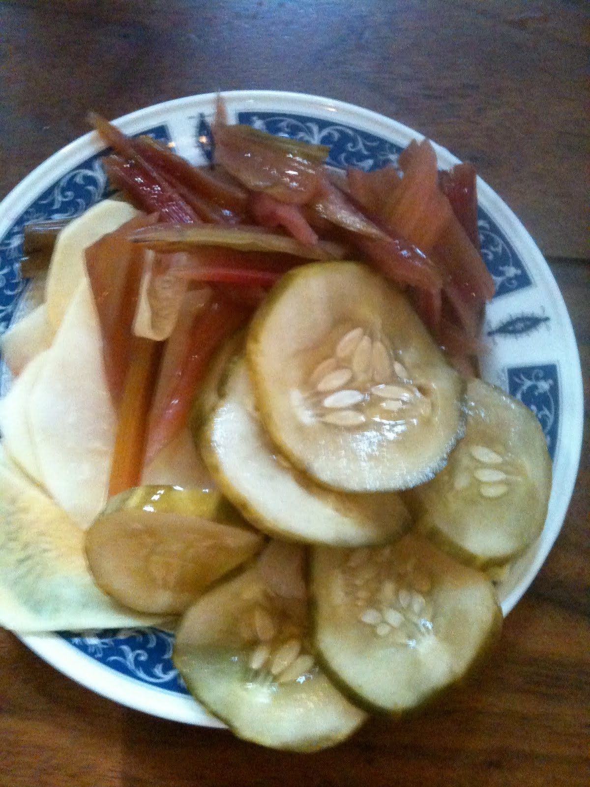 It’s that time or year when the abundance of fresh produce can be overwhelming, Many a time, I’ve gone to the farmers market with a loose plan in mind and returned home laden with way more produce than I can handle. That’s where the quick pickz come in. Put some up–it’s easy. Here’s a simple formula you can employ for whatever fresh crispy veges stirs your fancy! In this picture cucumbers are used along with the stems of Swiss chard (an excellent use for these tasty trimmings) and thnnly sliced raw turnips too. The awesome thing is that these pickz are the most wonderful flavor component to any barbecued meat. The crispy acidic crunch alongside the smokey spicy, juicy, drippy , fatty meat is what I’m talking about.