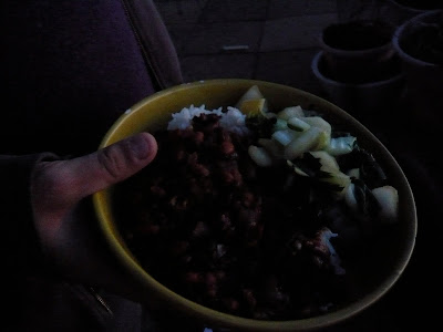 The most economical way to healthfully feed a group is to start with the dried beans–just a couple bucks for a bag which will feed a group of 6-8–total protein. Still-a couple cans of organic beans at under 2 bucks each–mightn’t have perfect texture but, the cooking is fast and the end result almost as good. But, seasoning and cooking and condiments–that’s where the art comes in. Tonight (in the dark–late to the table pic)–it’s canned, 3-beans. Saute onions, garlic, red pepper, hot pepper, cumin, oregano, tomato paste. Add the beans, a little water, make the rice–in that 20 minutes, dinner is served. Meanwhile, tonight I also did a fry up of some ginger, garlic and sliced bok choy for a side dish. But, if you can’t bear to cook–(yes, it happens here too)–we order black beans and yellow rice from La Caridad. WITH a avocado and onion salad too (with a squeeze of lemon and white pepper). Still–in a totally not-new-york-city-style, I really hate ordering out. Especially with my group. The price tag for one dinner is practically the whole weeks grocery bill.